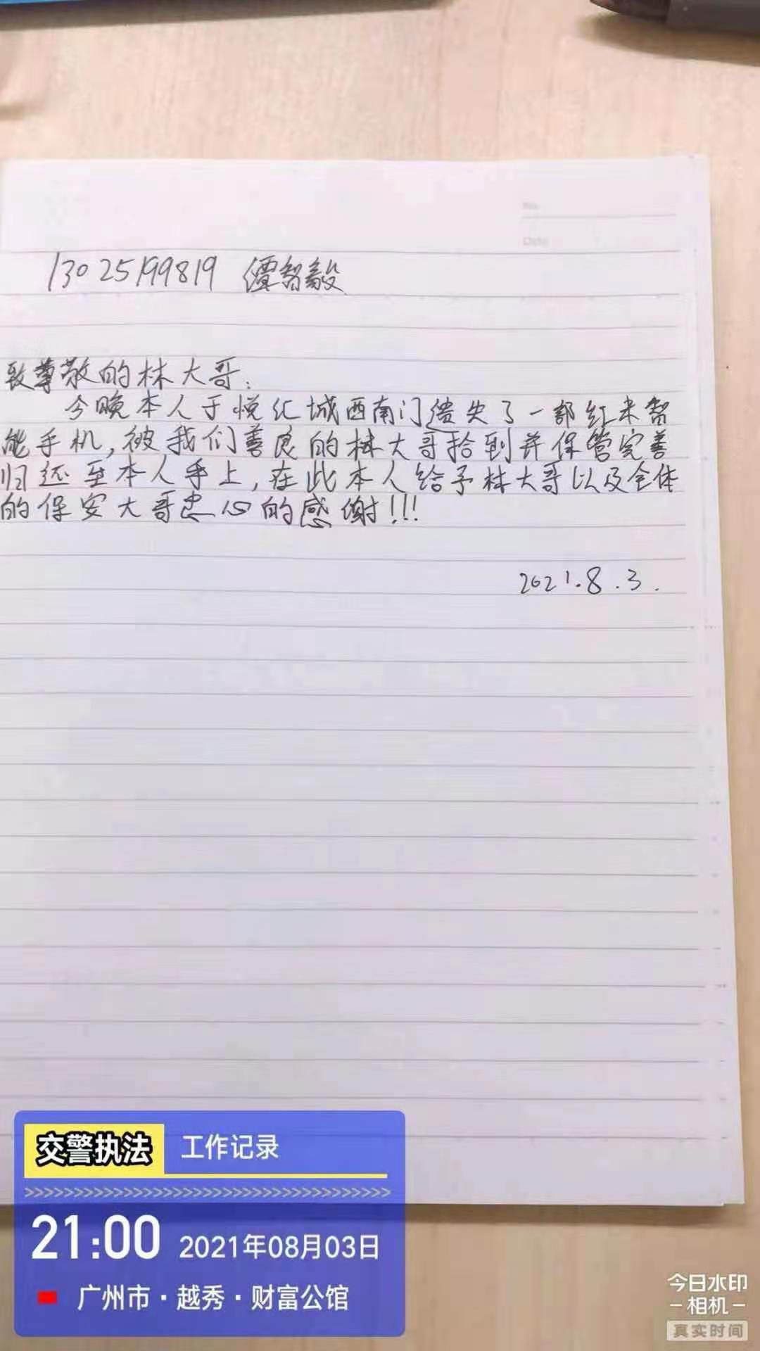 2021年8月3日,半岛站线体育网-半岛online(中国)驻西村悦汇城保安员林伟强像往常一样准备交接岗,当走至负一西南门门口的时候发现地上有一部黑色智能手机,林伟强在现场等待失主并上报了当班值班经理,不一会儿失主打电话过来,核实了失主身份后将失物归还。失主十分感动,并现场手写感谢信一封以表谢意。